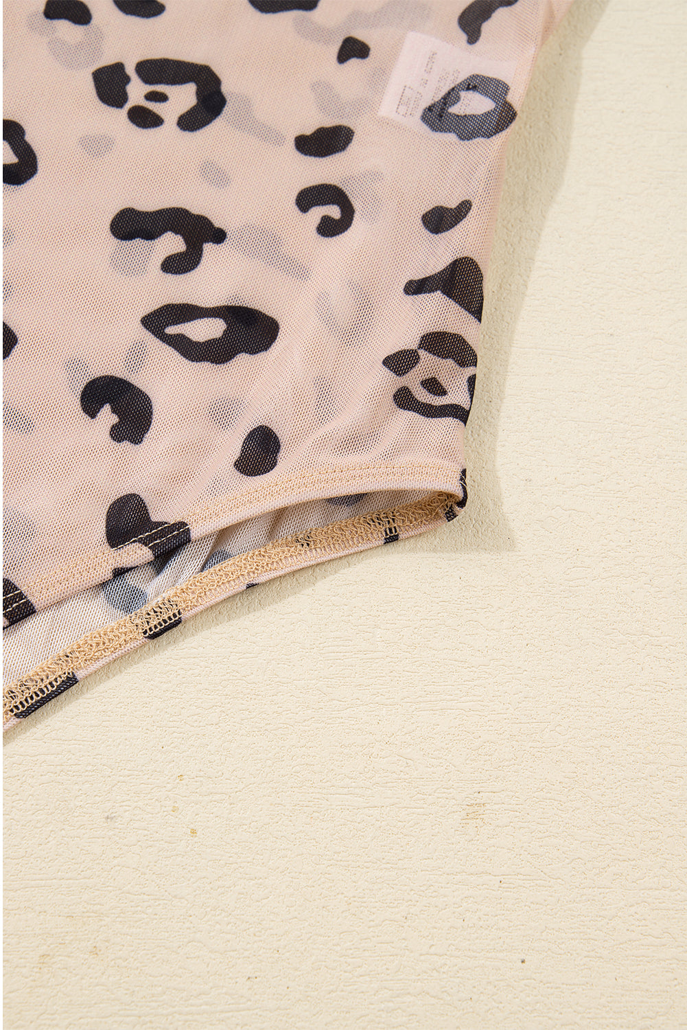 Khaki Mock Neck Sheer Mesh Leopard Long Sleeve Bodysuit