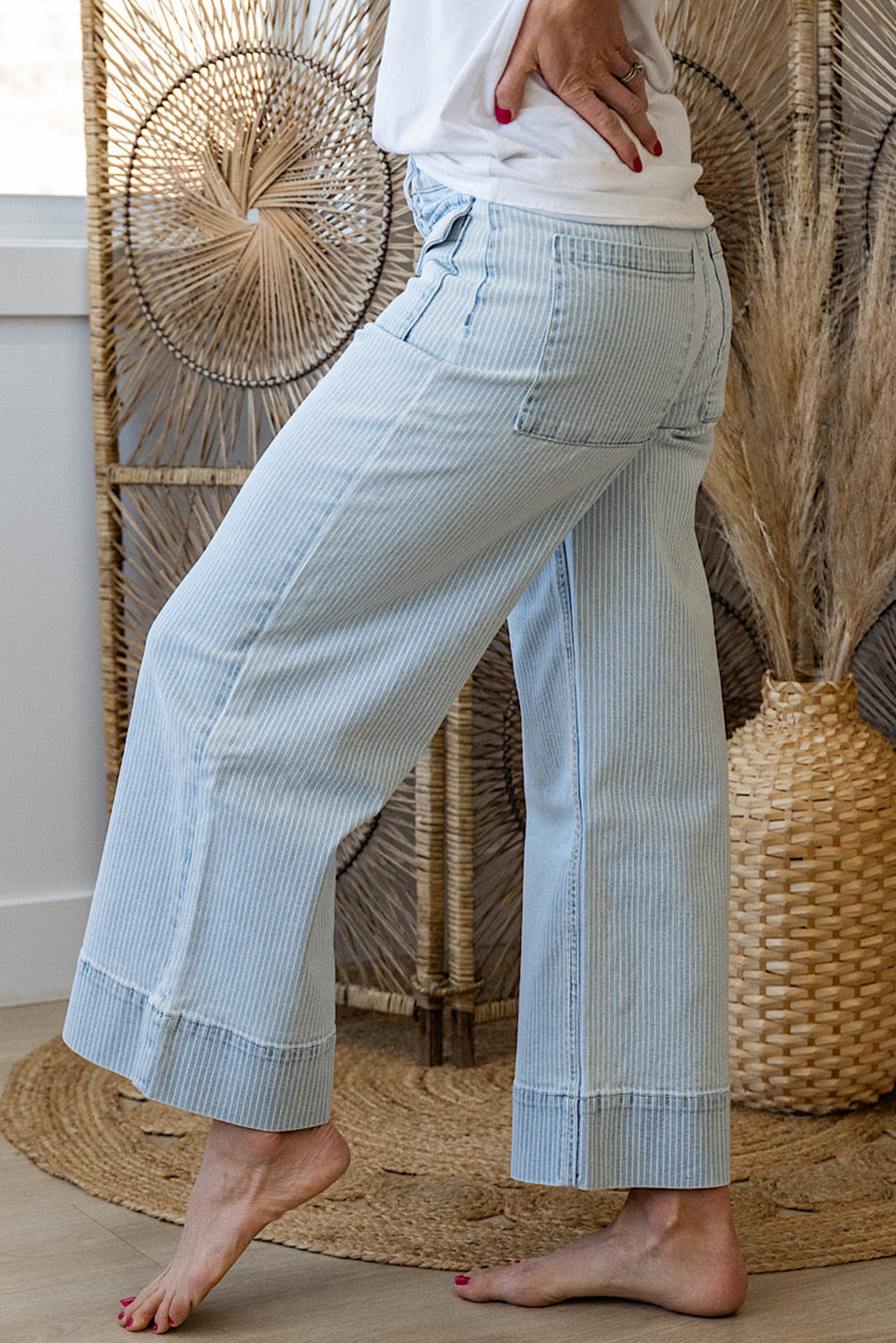 Sky Blue Stripe Button Flap Pocket Cuffed Hem Wide Leg Jeans